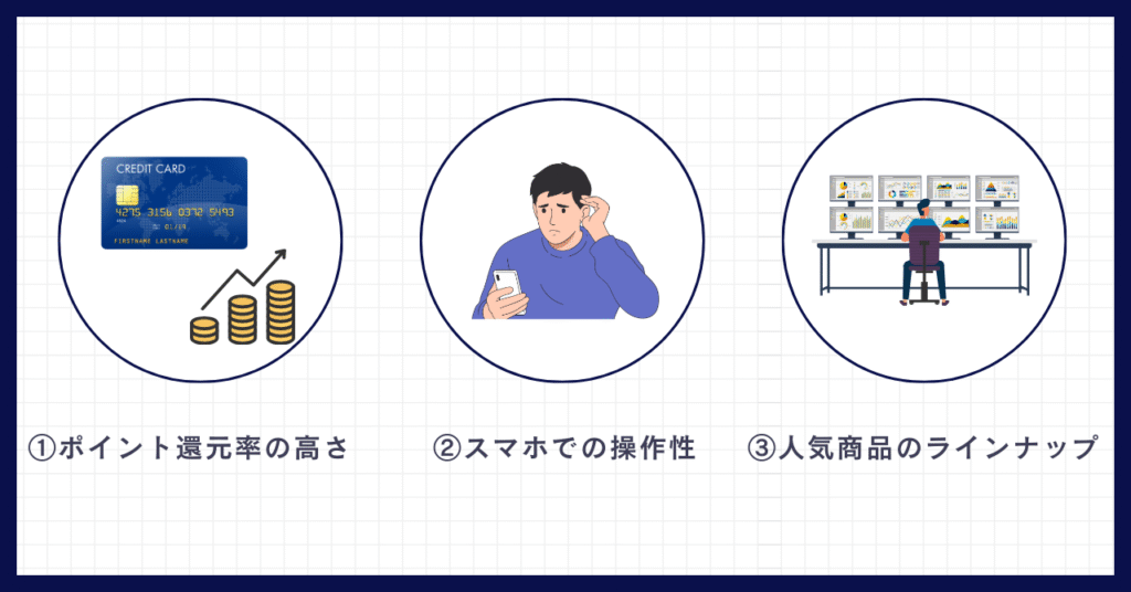 | 鉄則①:ポイント還元率の高さ | 普段の生活で貯めたポイントで投資ができ、自動でお金が増える仕組みを作れる。 |