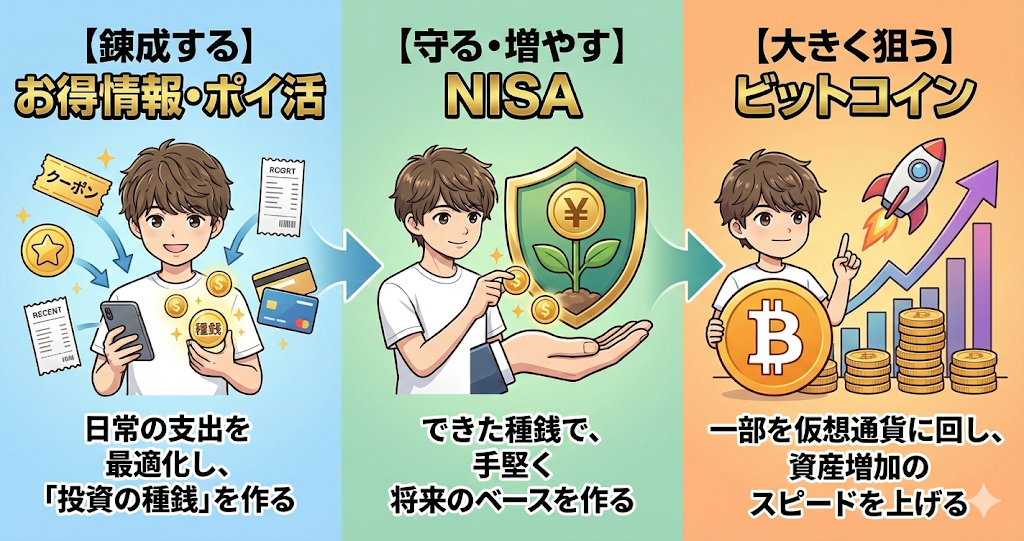 「お得情報で浮かせたお金を、NISA(守り)とビットコイン(攻め)に振り分ける」たったこれだけです。